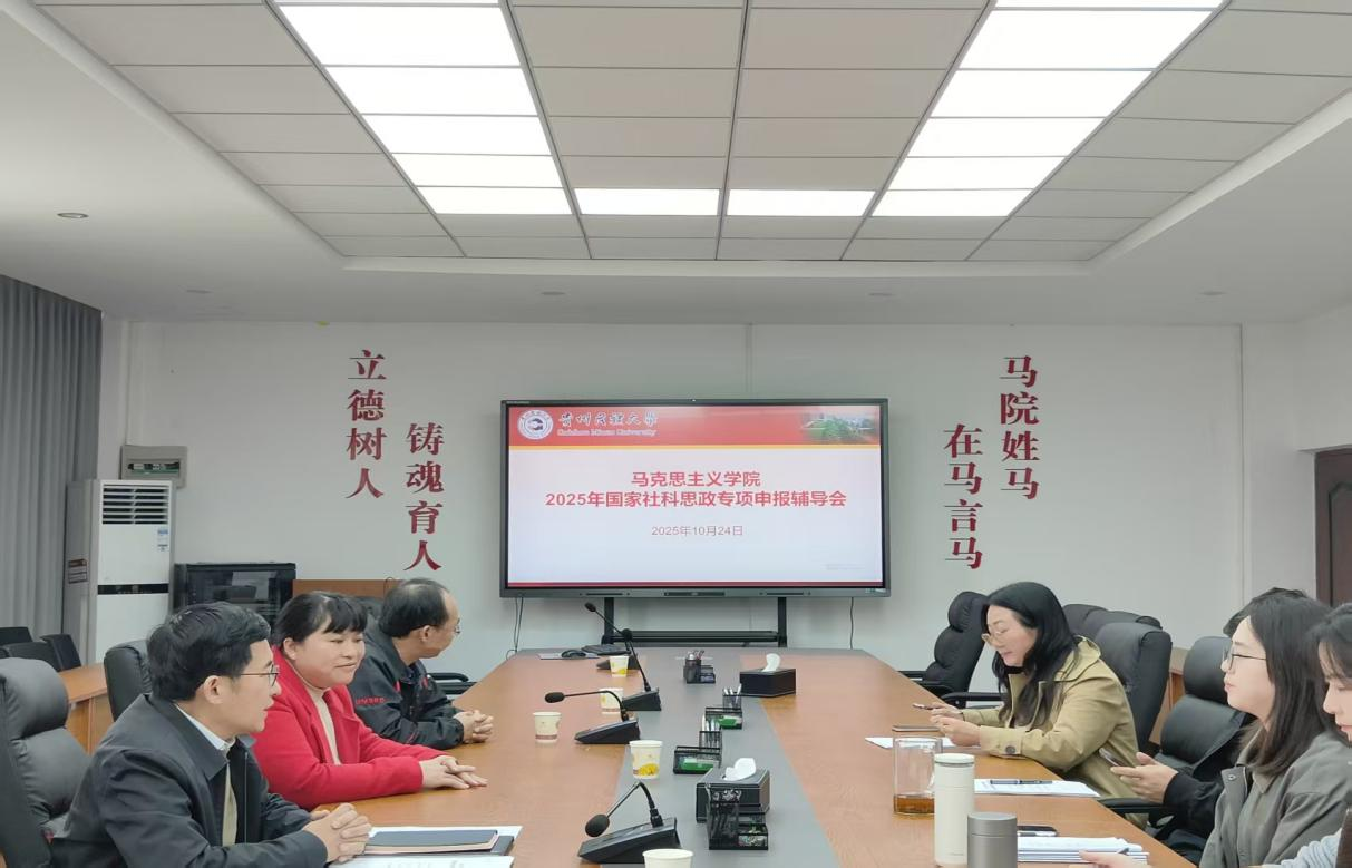 为提升我院马克思主义理论学科建设水平,进一步做好2025年国家社科基金思政专项的申报工作,2025年10月24日下午,露点直播 在7号楼529会议室召开2025年国家社科思政专项申报辅导会。学院邀请贵州大学郭红军、贵州师范大学章凤红、贵州中医药大学杨近平、贺菊莲等四名教授为学院申报教师进行辅导。会议由学院党委委员、副院长李昭勇主持,参会人员为申报2025年国家社科思政专项的严君、吴晓芳等14位老师。