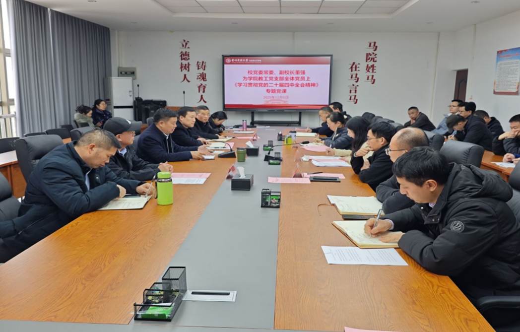 座谈交流后,校党委常委、副校长董强为学院教工党支部全体党员讲授《学习贯彻党的二十届四中全会精神》专题党课。他从全会精神的时代背景、核心内涵出发,阐释了新时代高校教师肩负的使命责任,引导全体党员深刻把握理论学习与教学实践结合的关键点,为支部党员筑牢思想根基、明晰育人方向。