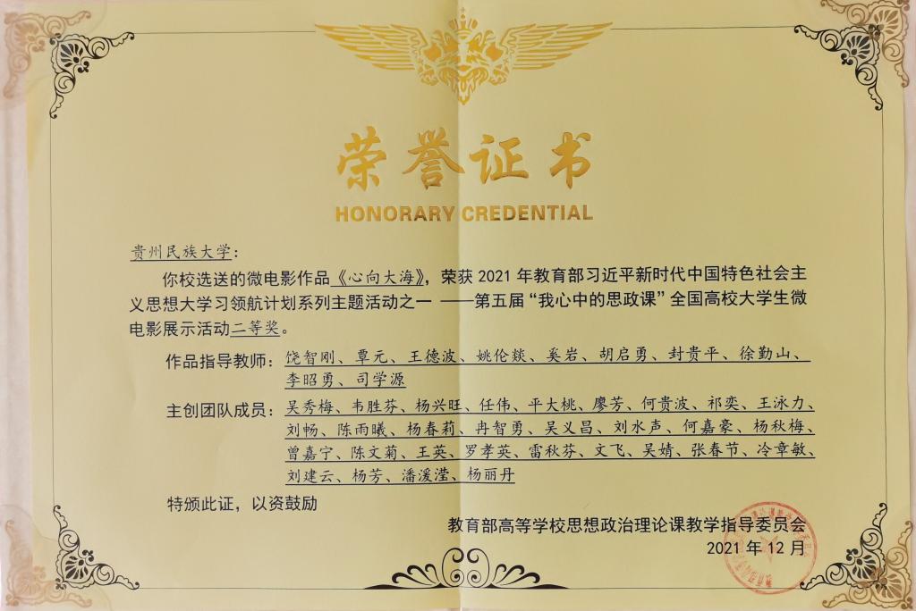 喜讯——《心向大海》荣获2021年全国高校大学生“我心中的思政课”微电影比赛二等奖