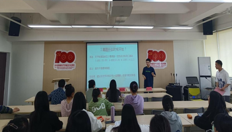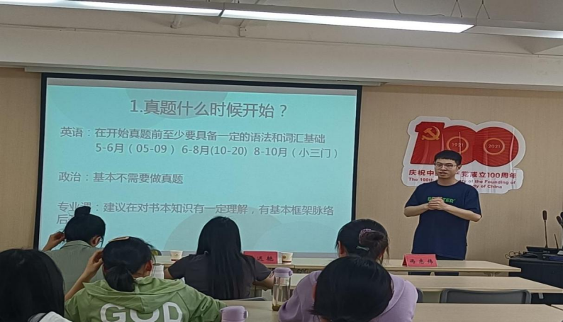 交流分享会上廖静、朱启燕、刘建云、任灵艳四位同学,分别从择校、备考、心态等方面为同学作细致分享,并进行交流互动,为有考研意向学生答疑解惑。